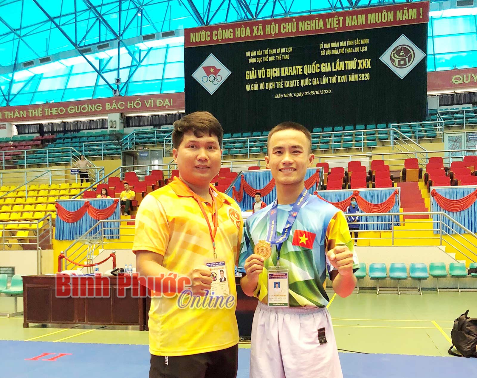Vận động viên Nguyễn Thái Duy chụp hình lưu niệm cùng Trưởng Bộ môn - HLV trưởng Đội tuyển Karate tỉnh Bình Phước sau khi nhận huy chươngDiễn ra từ ngày 9 đến 13-10, Giải vô địch Karate quốc gia lần thứ 30 năm 2020 đã thu hút hơn 260 vận động viên đến từ 35 tỉnh, thành, ngành trong cả nước, tranh 30 bộ huy chương. Kết quả chung cuộc, đoàn Hà Nội giành vị trí nhất toàn đoàn, thứ nhì là đoàn Công an và đoàn Quân đội xếp thứ ba.