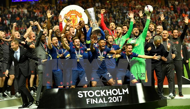 Niềm vui đăng quang của các cầu thủ MU sau khi giành chiến thắng trước Ajax Amsterdam trong trận chung kết UEFA Europa League trên sân Stockholm, Thụy Điển ngày 24/5. (Nguồn: EPA/TTXVN)