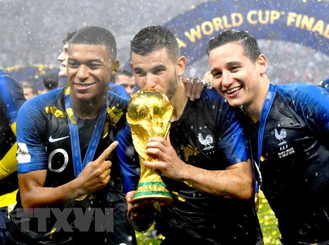 Các cầu thủ Pháp ăn mừng chức vô địch thế giới sau trận chung kết World Cup 2018 gặp Croatia ở Moskva, Nga ngày 15-7. (Nguồn: THX/TTXVN)