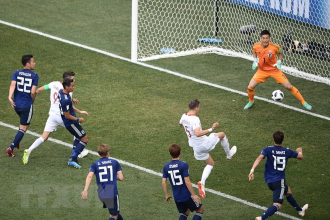 Cầu thủ Jan Bednarek (thứ 2 phải ) đội tuyển Ba Lan ghi bàn thắng vào lưới đội Nhật Bản. (Ảnh: AFP/TTXVN)