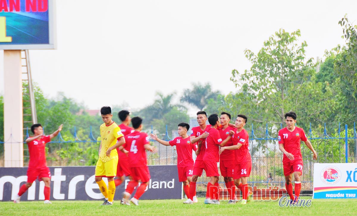 Các cầu thủ Bình Phước ăn mừng sau bàn thắng gỡ hòa ở cuối hiệp một