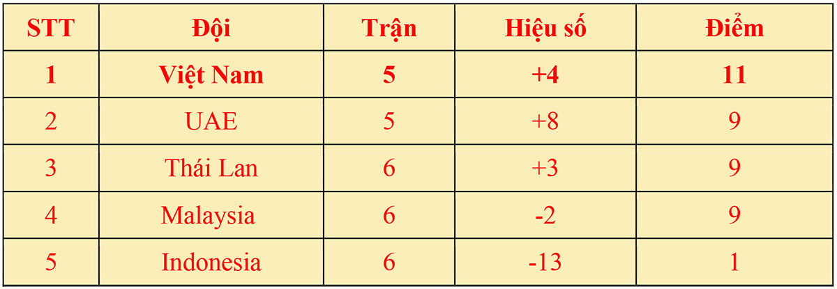Bảng xếp hạng vòng loại World Cup 2022 bảng G của ĐT Việt Nam: