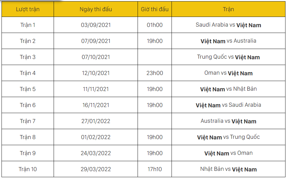 Theo lịch thi đấu vòng loại thứ 3 Wordcup 2022, tuyển Việt Nam sẽ có 10 trận đấu cho cả lượt đi và lượt về, bắt đầu từ ngày 3-9-2021 kéo dài đến cuối tháng 3 năm sau. Trong đó, trận đấu đầu tiên gặp tuyển Saudi Arabia lúc 01h00 sáng ngày 3-9 tới đây.
