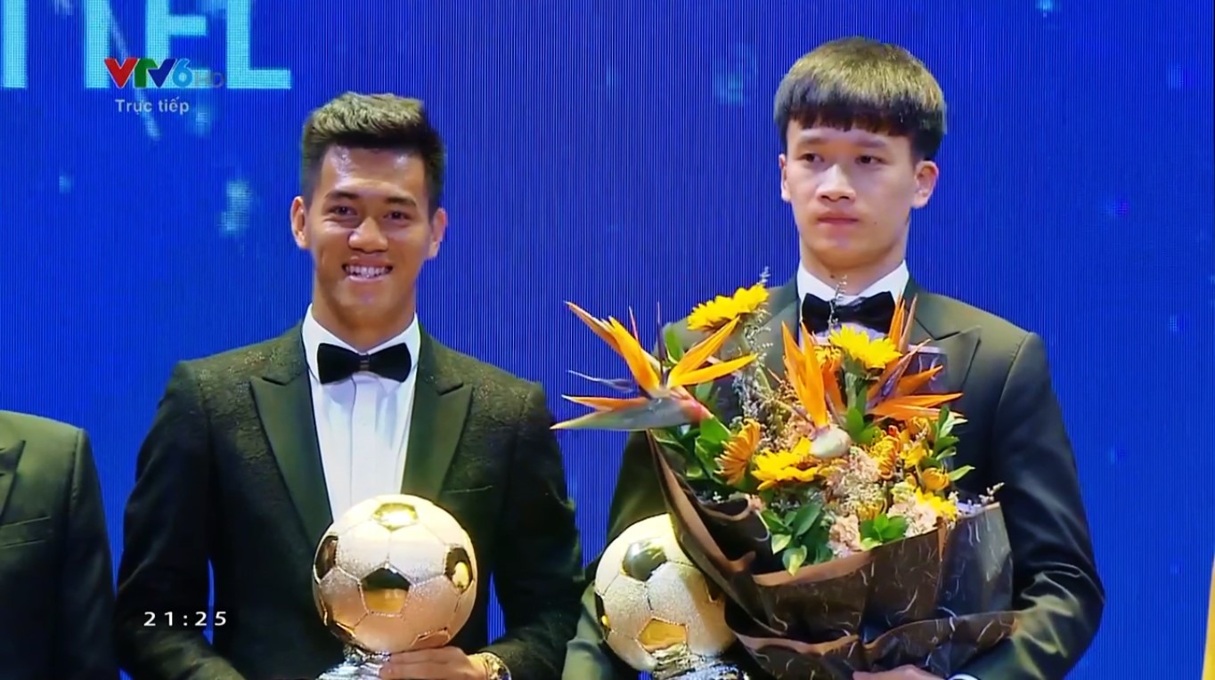 Quả bóng đồng Nguyễn Tiến Linh và Quả bóng vàng Nguyễn Hoàng Đức nhận giải thưởng. Ảnh chụp qua màn hình
