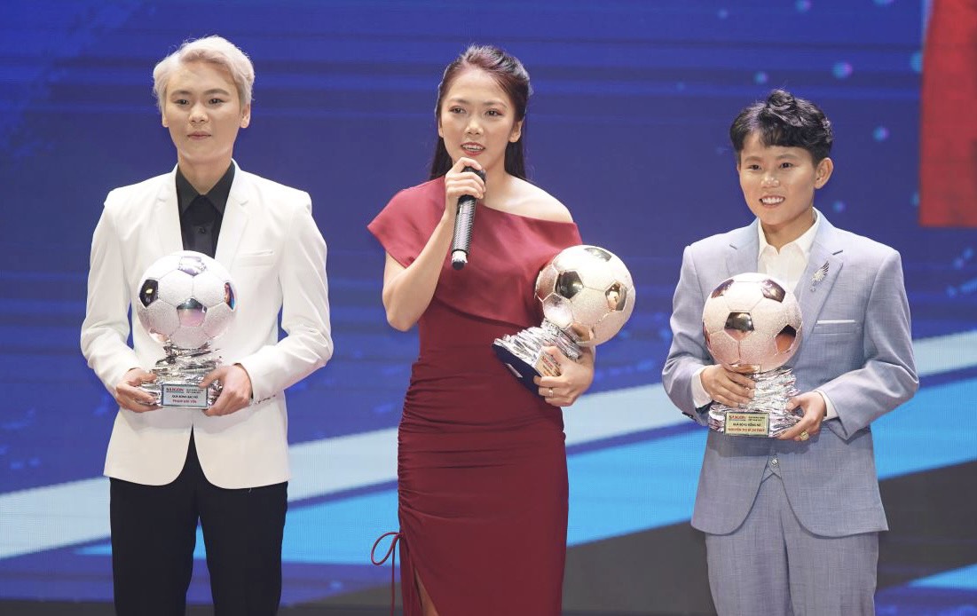 Từ trái qua: Quả bóng bạc Phạm Hải Yến, Quả bóng vàng Huỳnh Như và Quả bóng đồng Nguyễn Thị Bích Thùy. Ảnh: BTC