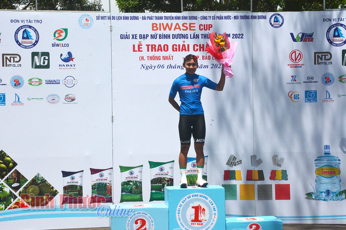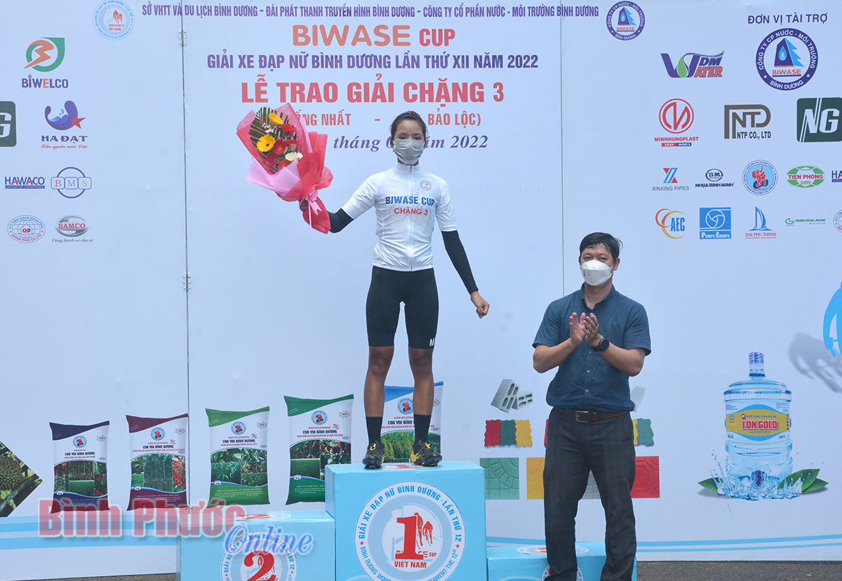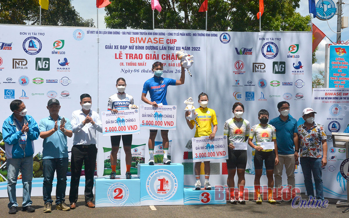 VĐV Nguyễn Thị Thật (Công ty cổ phần Tập đoàn Lộc Trời) cùng Bùi Thị Quỳnh và Đinh Thị Như Quỳnh (Biwase Bình Dương) được vinh danh ngay sau khi chặng đua kết thúc
