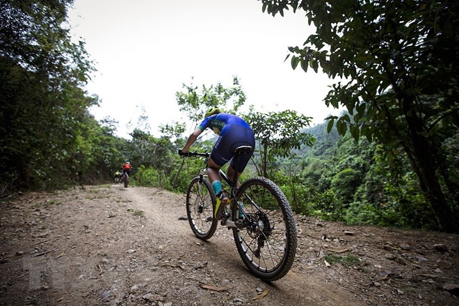 Đội đua xe đạp địa hình Việt Nam tại đường đua địa hình tại tỉnh Hoà Bình. (Ảnh: Trọng Đạt/TTXVN)