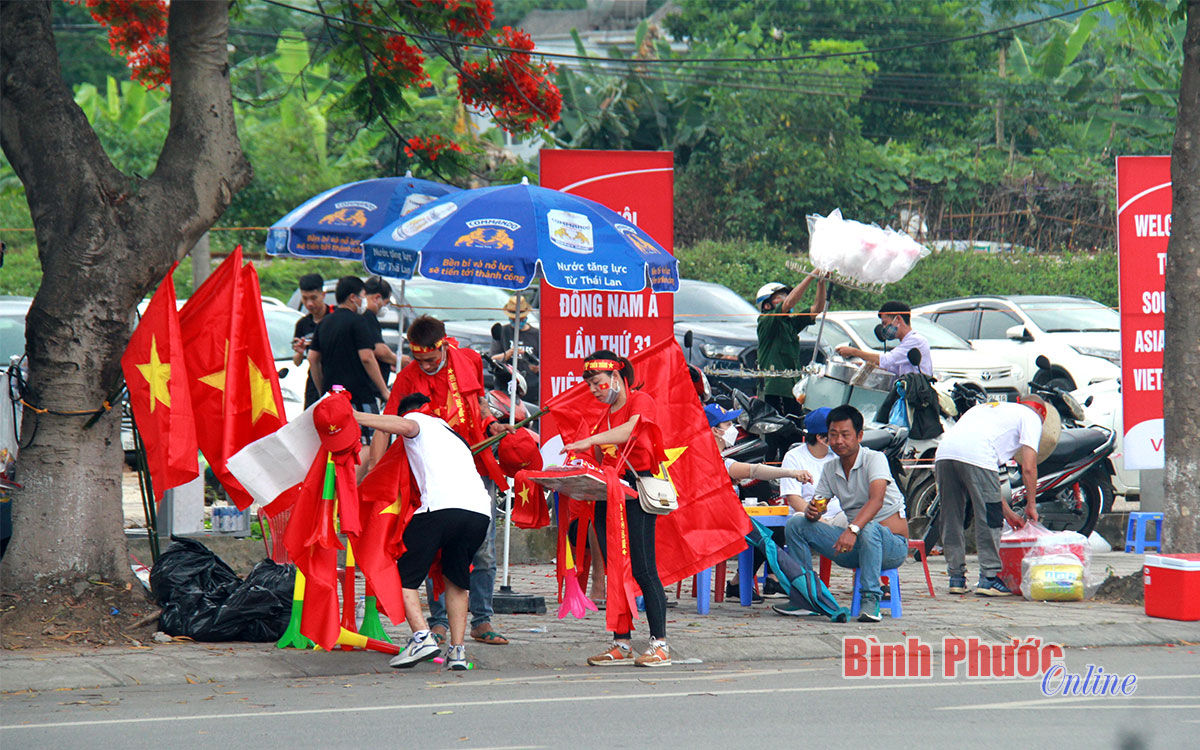 Từ rất sớm, nhiều người dân thành phố Việt Trì đã bày bán cờ Tổ quốc, stick dán… cho các cổ động viên dọc 2 bên đường Hùng Vương trước Sân vận động Việt Trì