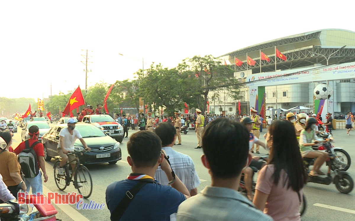 Hội cổ động viên Việt Nam tỉnh Phú Thọ diễu hành xung quanh Sân vận động Việt Trì trước trận đấu để cổ vũ U23 Việt Nam