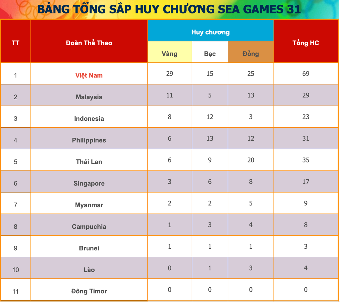 Bảng tổng sắp huy chương tại SEA Games 31 cập nhật đến 12 giờ ngày 14-5