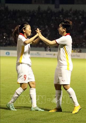 Cầu thủ nữ Việt Nam ăn mừng sau khi ghi bàn thắng. Ảnh: Anh Tuấn/TTXVN