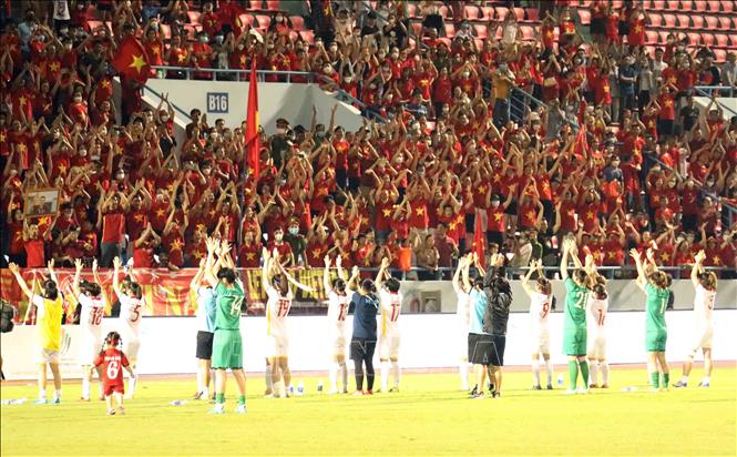 Các cầu thủ đội tuyển nữ Việt Nam chào cổ động viên khi kết thúc trận đấu. Ảnh: Anh Tuấn/TTXVN