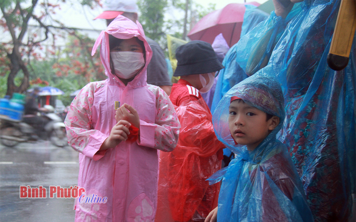 Các cổ động viên “nhí” cũng mặc áo mưa đi cùng bố mẹ đến Sân vận động Việt Trì cổ vũ trận U23 Việt Nam gặp U23 Timor Leste