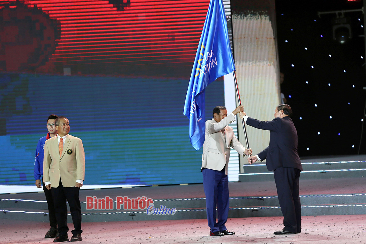 Thủ tướng Chính phủ Phạm Minh Chính tuyên bố bế mạc SEA Games 31 và hẹn gặp lại ở SEA Games 32 trên đất nước Campuchia. Đinh Phương Thành, vận động viên tiêu biểu của Thể thao Việt Nam, rước lá cờ của Liên đoàn Thể thao Đông Nam Á để Bộ trưởng Bộ Văn hóa, Thể thao và Du lịch Nguyễn Văn Hùng trân trọng trao lại cho Ngài Thong Khon - Chủ tịch Ủy ban Olympic Campuchia - Bộ trưởng Du lịch Campuchia, chủ nhà SEA Games 2023.