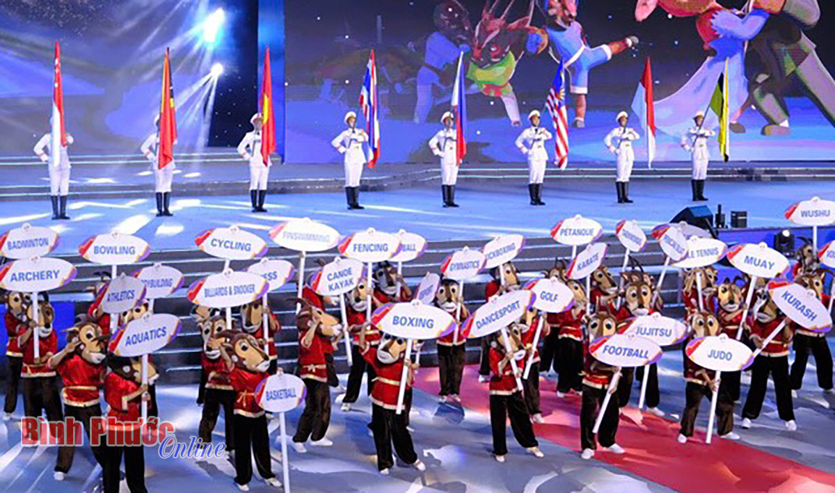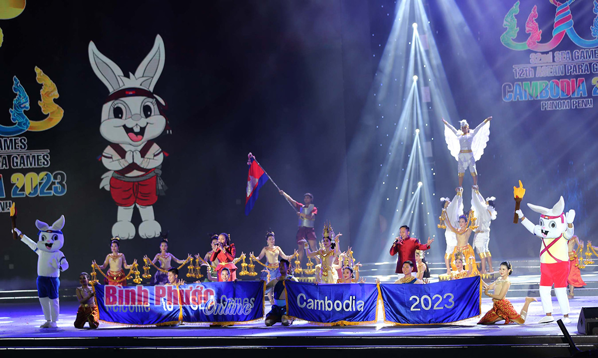 Sau lễ chuyển giao cờ Liên đoàn thể thao Đông Nam Á cho Campuchia - nước chủ nhà của SEA Games 32, chương trình biểu diễn nghệ thuật chào mừng của Campuchia với vũ điệu Apsara - biểu tượng của văn hóa, tâm hồn và bản sắc của người Khmer. Nghệ sĩ Campuchia trình diễn các tiết mục đặc sắc gồm: Hoa hồng Phnôm Pênh do cựu quốc vương Norodom Sihanouk sáng tác, múa đương đại Linh vật Bồ câu trắng và trình bày ca khúc Cambodia Welcoming and Blessing Song (Chào đón và chúc phúc cho Campuchia).