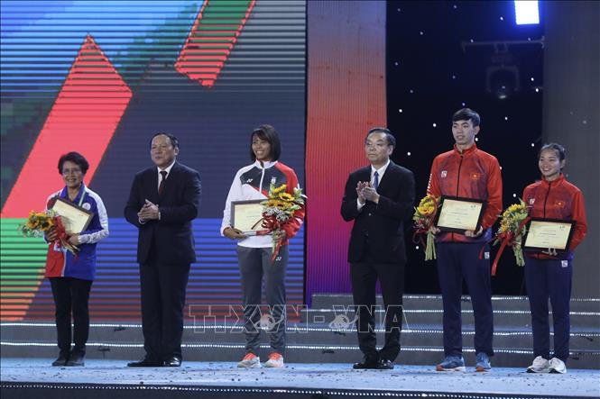 Ông Nguyễn Văn Hùng, Bộ trưởng Bộ VH, TT và DL, Chủ tịch Liên đoàn thể thao Đông Nam Á, Chủ tịch Ủy ban Olympic Việt Nam, Trưởng Ban tổ chức SEA Games 31 và ông Chu Ngọc Anh, Chủ tịch UBND TP Hà Nội trao Bằng vinh danh 4 VĐV xuất sắc nhất của SEA Games 31, gồm: Nguyễn Thị Oanh (Việt Nam, 3 HCV), Joshua Robert Atkinson (Thái Lan, 4 HCV), Nguyễn Huy Hoàng (Việt Nam, 5 HCV), Jing Wen Quah (Singapore, 6 HCV). Ảnh: TTXVN