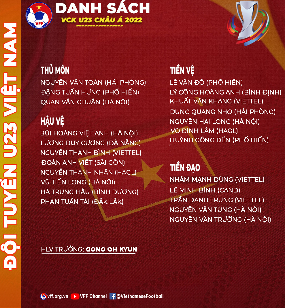 Khi triệu tập đội hình dự vòng chung kết U23 châu Á, HLV Gong Oh-kyun gọi 14 cầu thủ từ đội hình vừa giành huy chương vàng môn bóng đá nam SEA Games 31. Toàn bộ những cái tên này được giữ lại trong danh sách đăng ký với AFC.