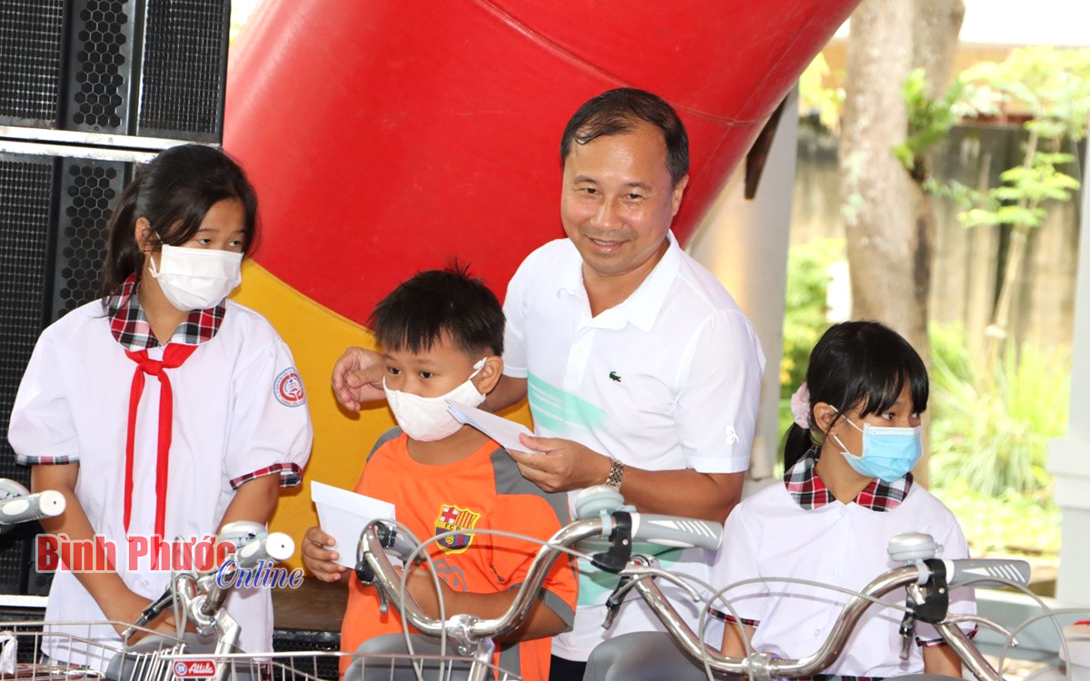 Chủ tịch UBND huyện Đồng Phú Nguyễn Anh Tuấn tặng quà cho các em học sinh khó khăn trên địa bàn huyện