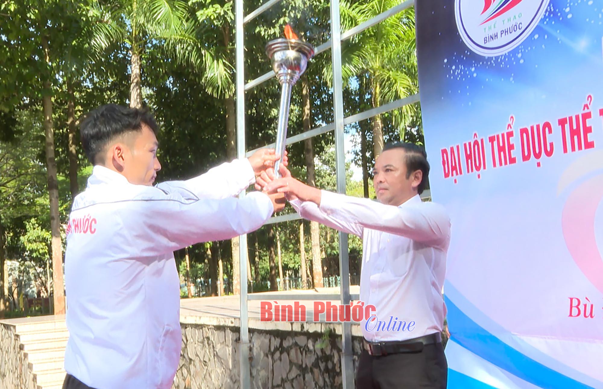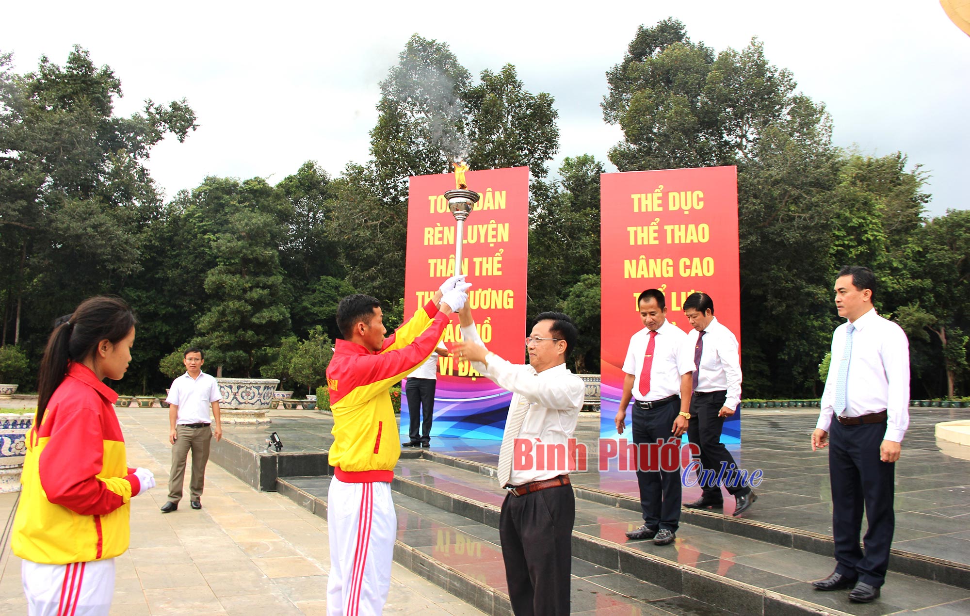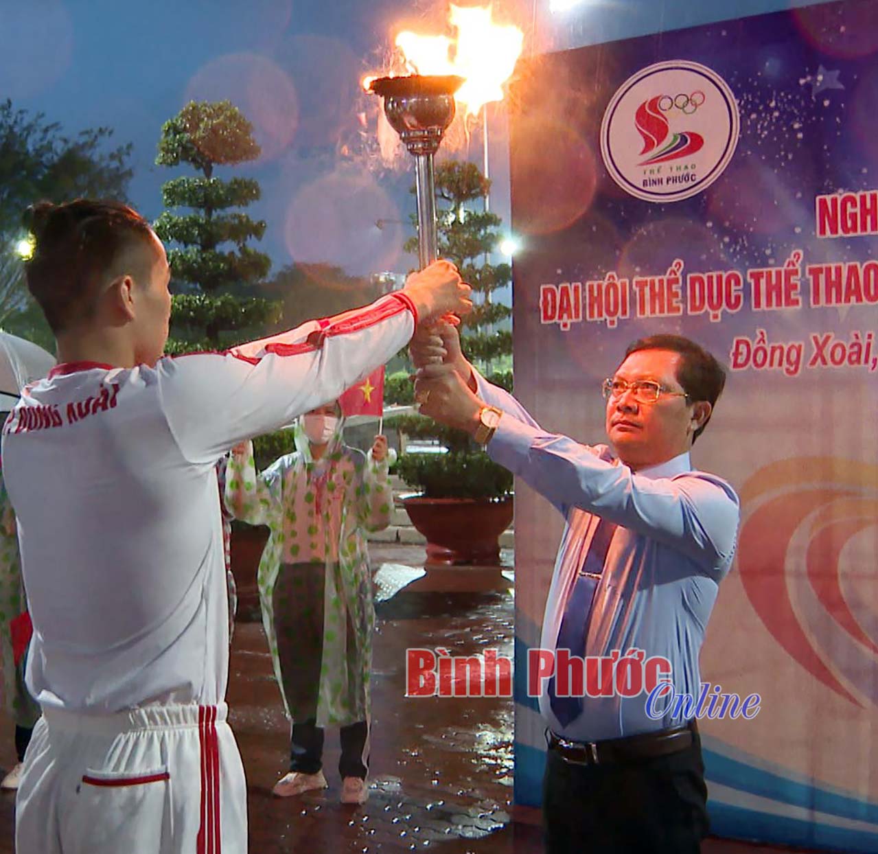 Giám đốc Sở Văn hóa - Thể thao và Du lịch, Trưởng ban tổ chức đại hội Trần Văn Chung thực hiện nghi lễ xin lửa, châm đuốc và truyền đuốc cho đoàn VĐV tiêu biểu huyện Lộc Ninh khởi đầu hành trình