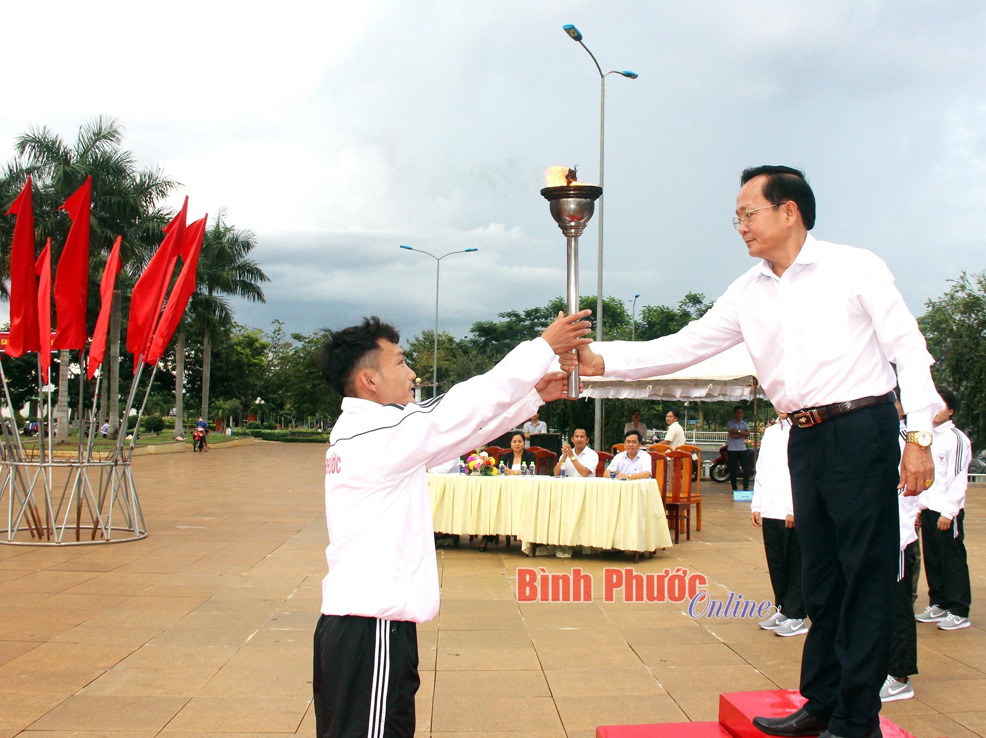 Phó bí thư Thường trực Thị ủy Phước Long Nguyễn Ngọc Công tiếp nhận và truyền đuốc cho đoàn VĐV Phước Long thực hiện nghi lễ diễu hành