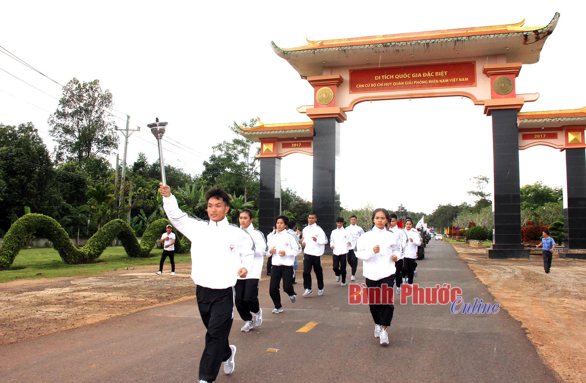 Đoàn VĐV huyện Lộc Ninh truyền đuốc cho đoàn VĐV tỉnh hộ tống ngọn đuốc rời Khu di tích Quốc gia đặc biệt Căn cứ Bộ chỉ huy Quân giải phóng miền Nam Việt Nam