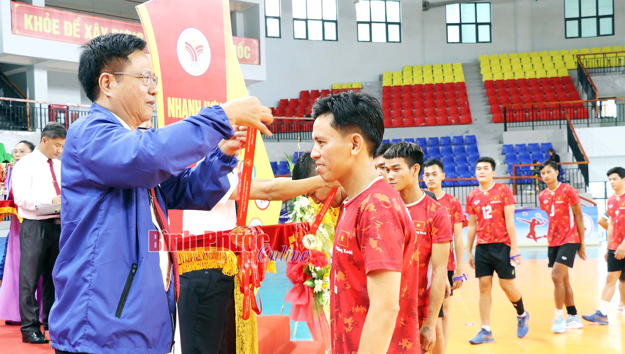 Giám đốc Sở Văn hóa, Thể thao và Du lịch Trần Văn Chung trao huy chương vàng môn bóng chuyền nam cho các vận động viên của đơn vị TP. Đồng Xoài
