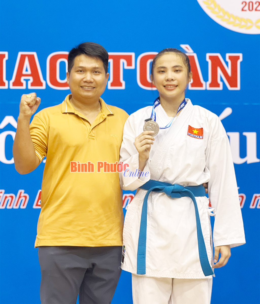 Vận động viên Vũ Thị Ngọc Thanh chụp hình cùng Huấn luyện viên Karate tỉnh Bình Phước Nguyễn Thành Lên sau khi nhận huy chương bạc