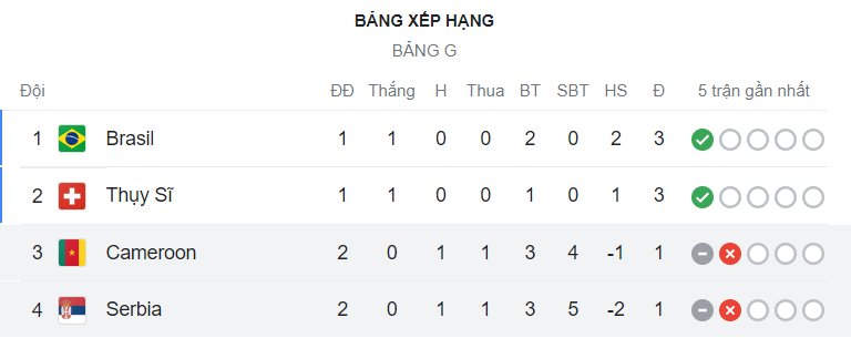 Cục diện của bảng G sau khi trận đấu Cameroon vs Serbia kết thúc