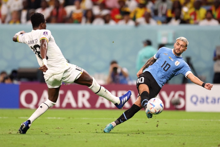 Bỏ lỡ cơ hội ghi bàn, Ghana trả giá đắt bởi sự lọc lõi và tinh quái của Uruguay. Phút 26, Nunez thực hiện đường chuyền loại bỏ toàn bộ hàng phòng ngự Ghana, tạo điều kiện cho Suarez đón bóng rồi cứa lòng khiến thủ môn Ati Zigi phải đổ người đẩy bóng cứu thua. Giorgian de Arrascaeta sau đó băng vào đá bồi ghi bàn mở tỷ số cho Uruguay.