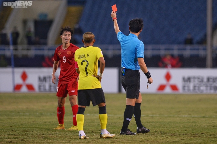 Dù vậy, khó khăn lại ập đến với thầy trò Park Hang Seo. Phút 32, Văn Toàn nhận thẻ vàng thứ hai rời sân sau pha vào bóng với Dominic Tan của Malaysia. Đội khách lấy lại thế trận và tổ chức hãm thành liên tục.