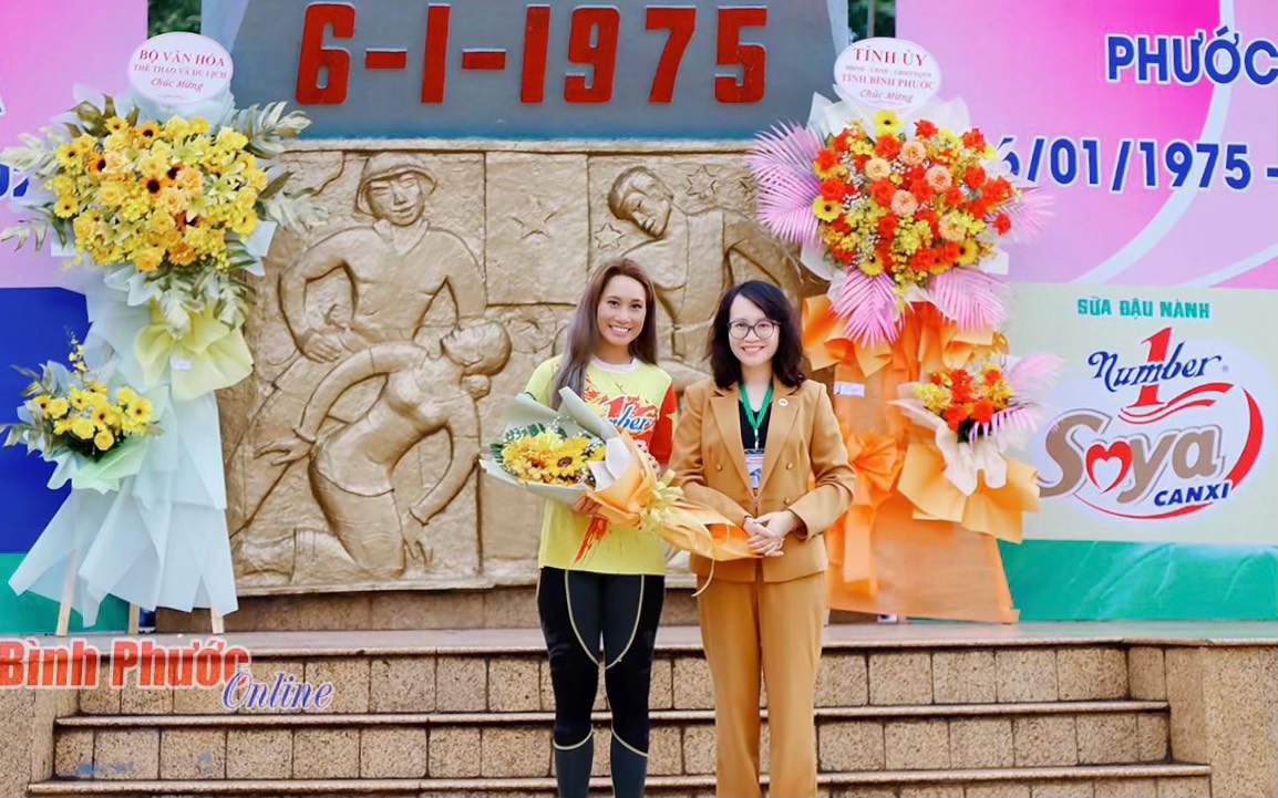Tỉnh ủy viên, Giám đốc - Tổng Biên tập Đài Phát thanh - Truyền hình và Báo Bình Phước, Phó Trưởng ban Tổ chức giải Nguyễn Thị Minh Nhâm tặng hoa tri ân Đại sứ thương hiệu Number 1 của Tập đoàn Tân Hiệp Phát Vũ Phương Thanh đã luôn đồng hành với giải