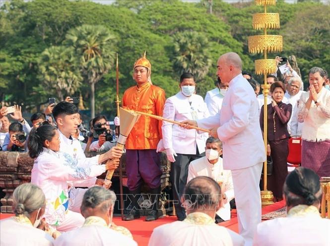 Quốc vương Campuchia Preah Bat Samdech Preah Boromneath Norodom Sihamoni, cùng với Thủ tướng Samdech Techo Hun Sen và nhiều quan chức cấp cao khác tới dự Lễ xin lửa và khởi động hoạt động rước đuốc cho SEA Games 32 và ASEAN Para Games 12. Ảnh: AKP/TTXVN