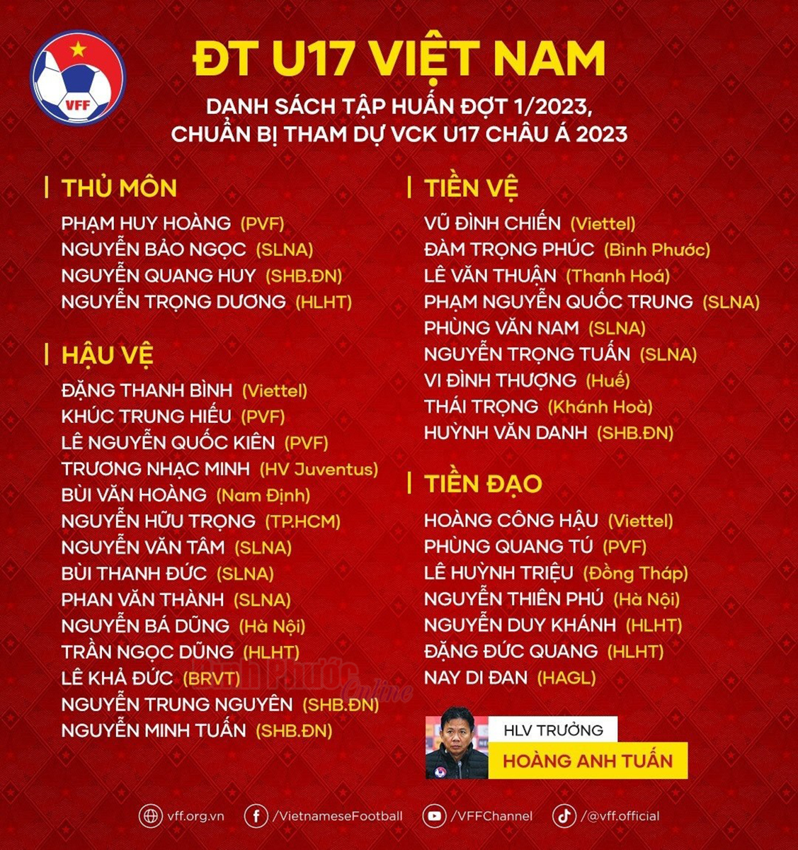 Danh sách U17 Việt Nam hội quân đợt 1 năm 2023