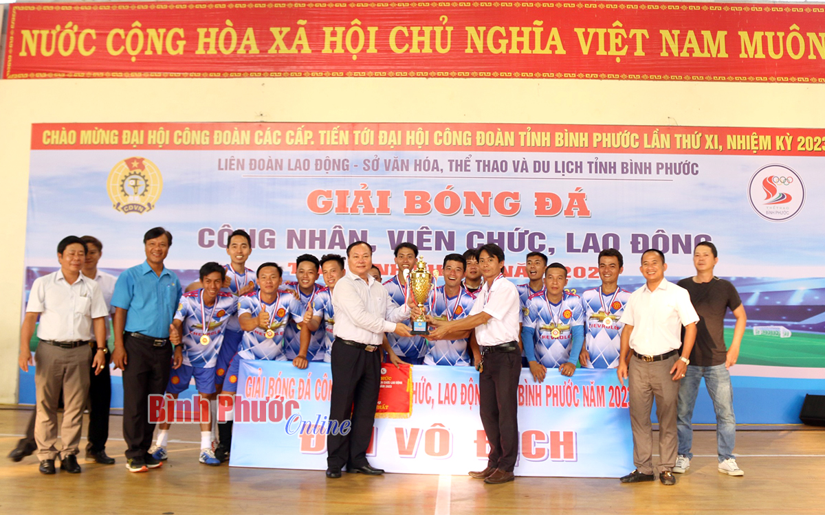 Đại diện Ban tổ chức trao cúp vô địch cho đội bóng đá nam Liên đoàn Lao động thị xã Phước Long