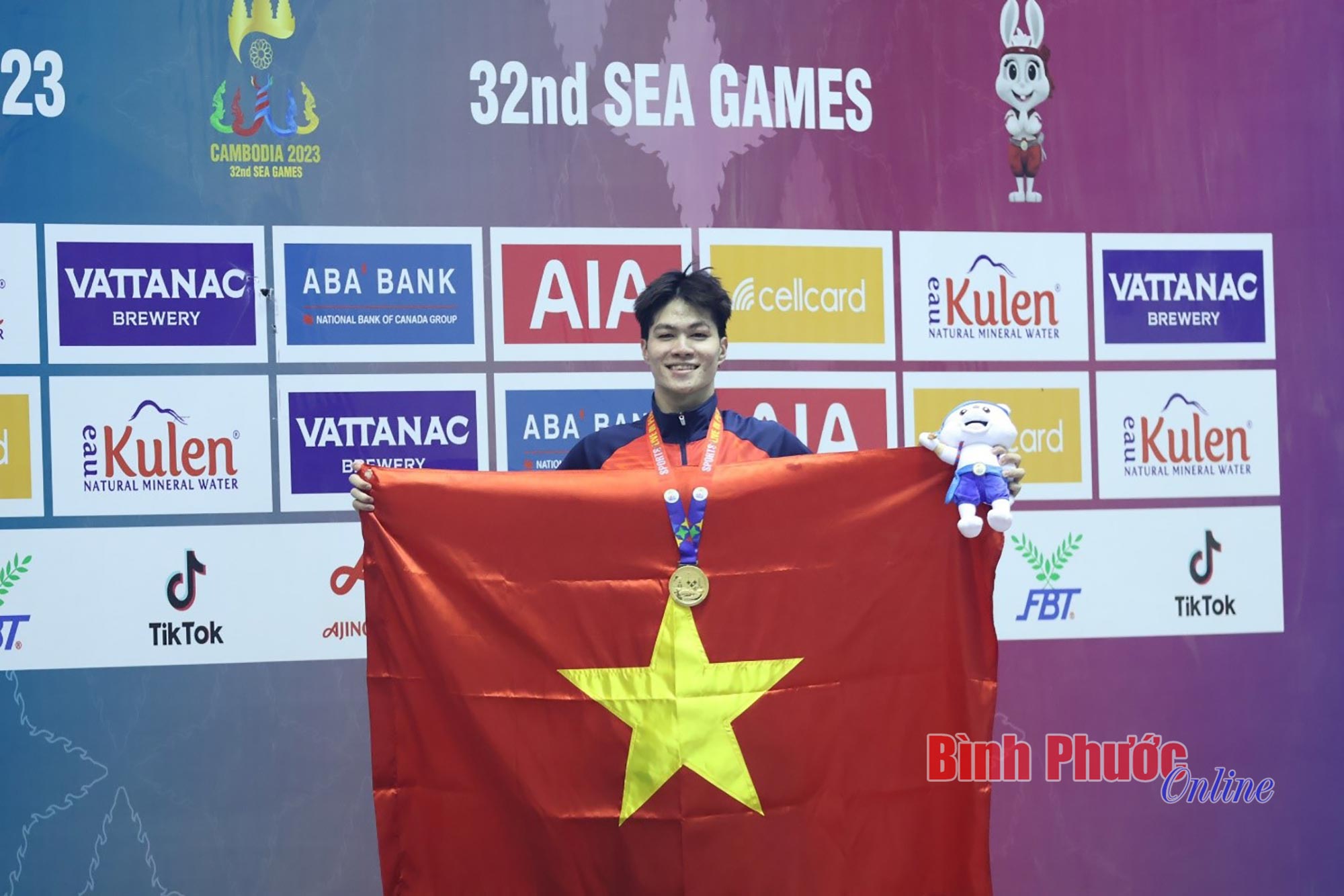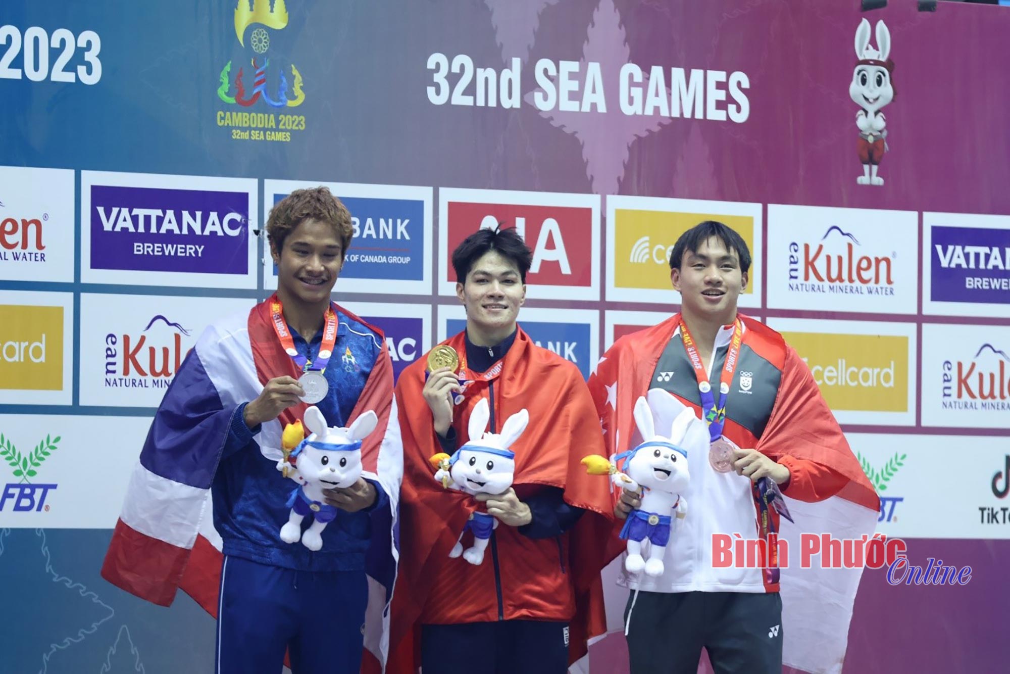 Kình ngư Trần Hưng Nguyên (giữa) của Việt Nam giành Huy chương vàng nội dung 200m hỗn hợp nam tại SEA Games 32