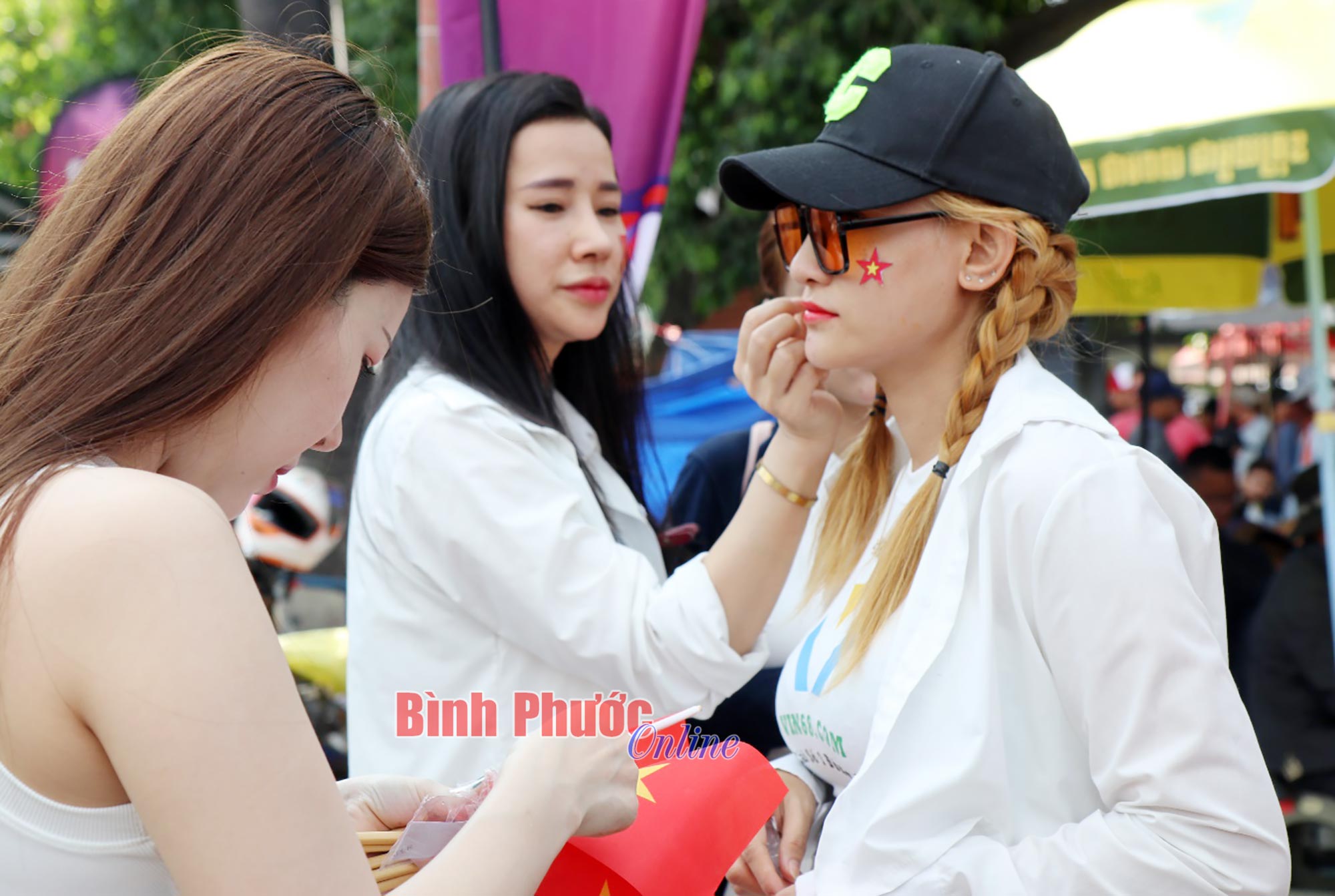 Các nữ cổ động viên xinh đẹp của U22 Việt Nam đang “trang trí” cho nhau để vào cổ vũ cho thầy trò ông Philippe Troussier