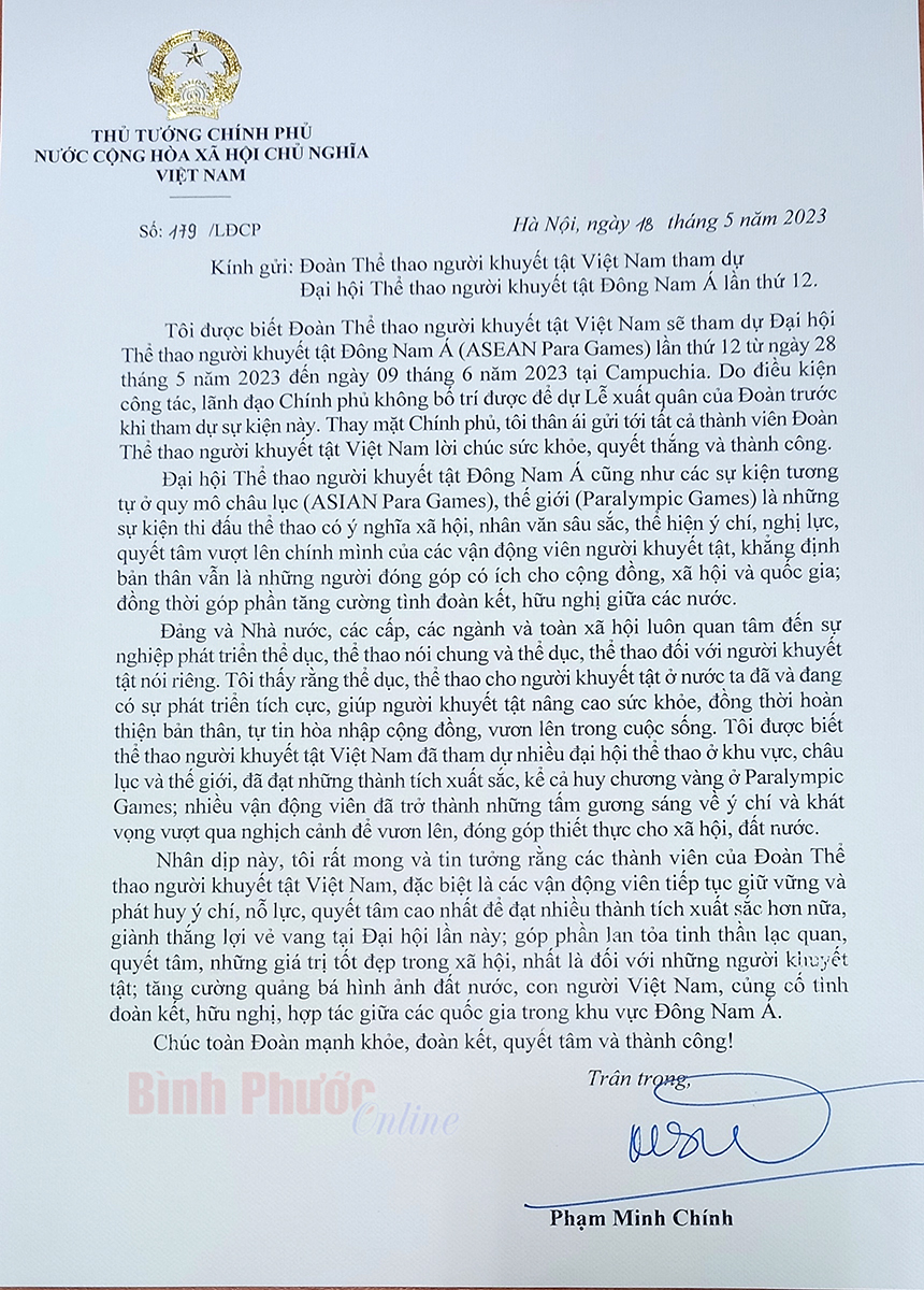 Trong thư, Thủ tướng Chính phủ Phạm Minh Chính viết: “Tôi được biết đoàn thể thao người khuyết tật Việt Nam sẽ tham dự Đại hội Thể thao người khuyết tật Đông Nam Á (ASEAN Para Games) lần thứ 12 từ ngày 28-5 đến ngày 9-6 tại Campuchia. Do điều kiện công tác, lãnh đạo Chính phủ không bố trí được để dự lễ xuất quân của đoàn trước khi tham dự sự kiện này. Thay mặt Chính phủ, tôi thân ái gửi tới tất cả thành viên đoàn thể thao người khuyết tật Việt Nam lời chúc sức khỏe, quyết thắng và thành công”.