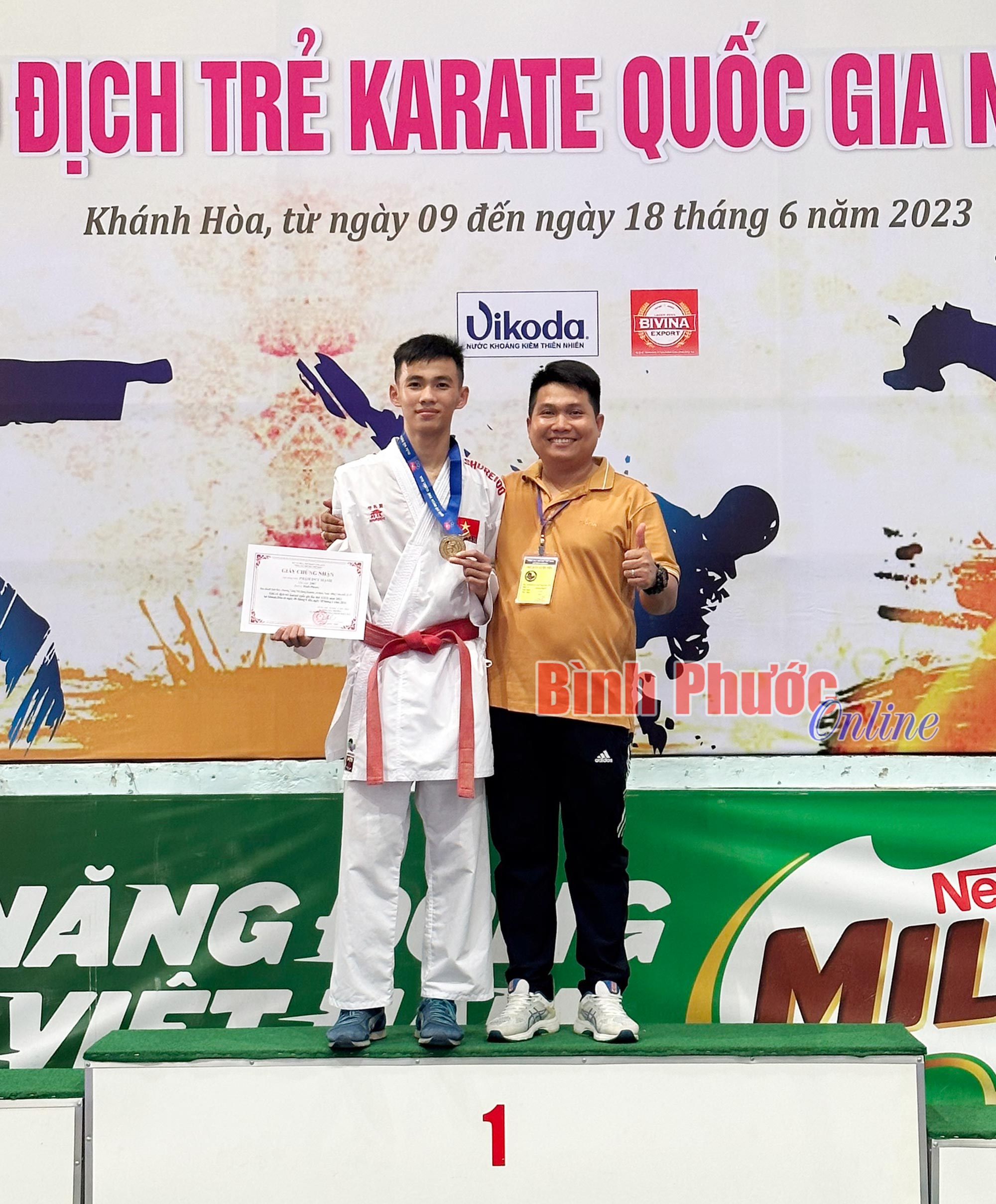 HCV kumite cá nhân nam hạng 60kg Phạm Duy Mạnh cùng huấn luyện viên tuyển karate Bình Phước Nguyễn Thành Lên
