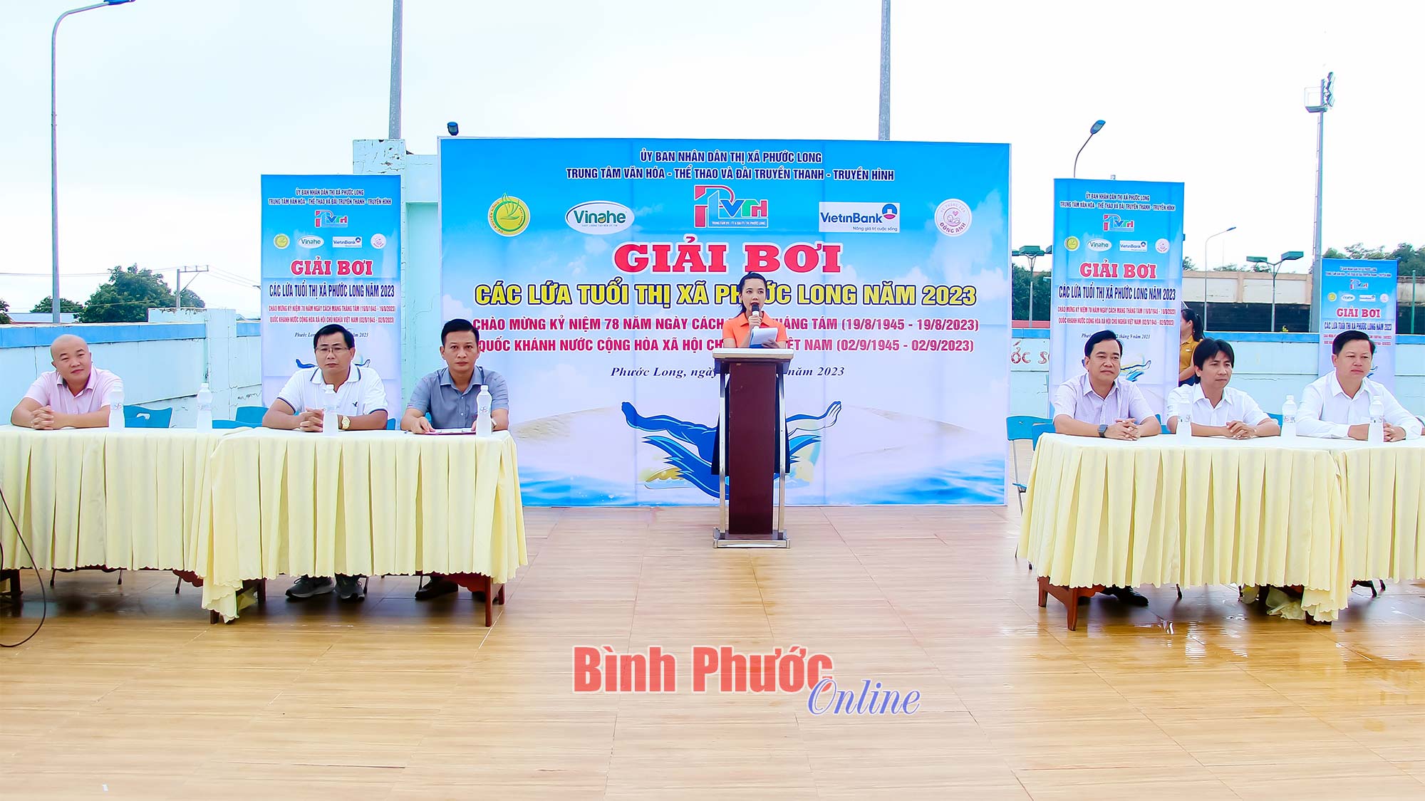 Các đại biểu tham dự lễ khai mạc giải bơi các lứa tuổi thị xã Phước Long 2023