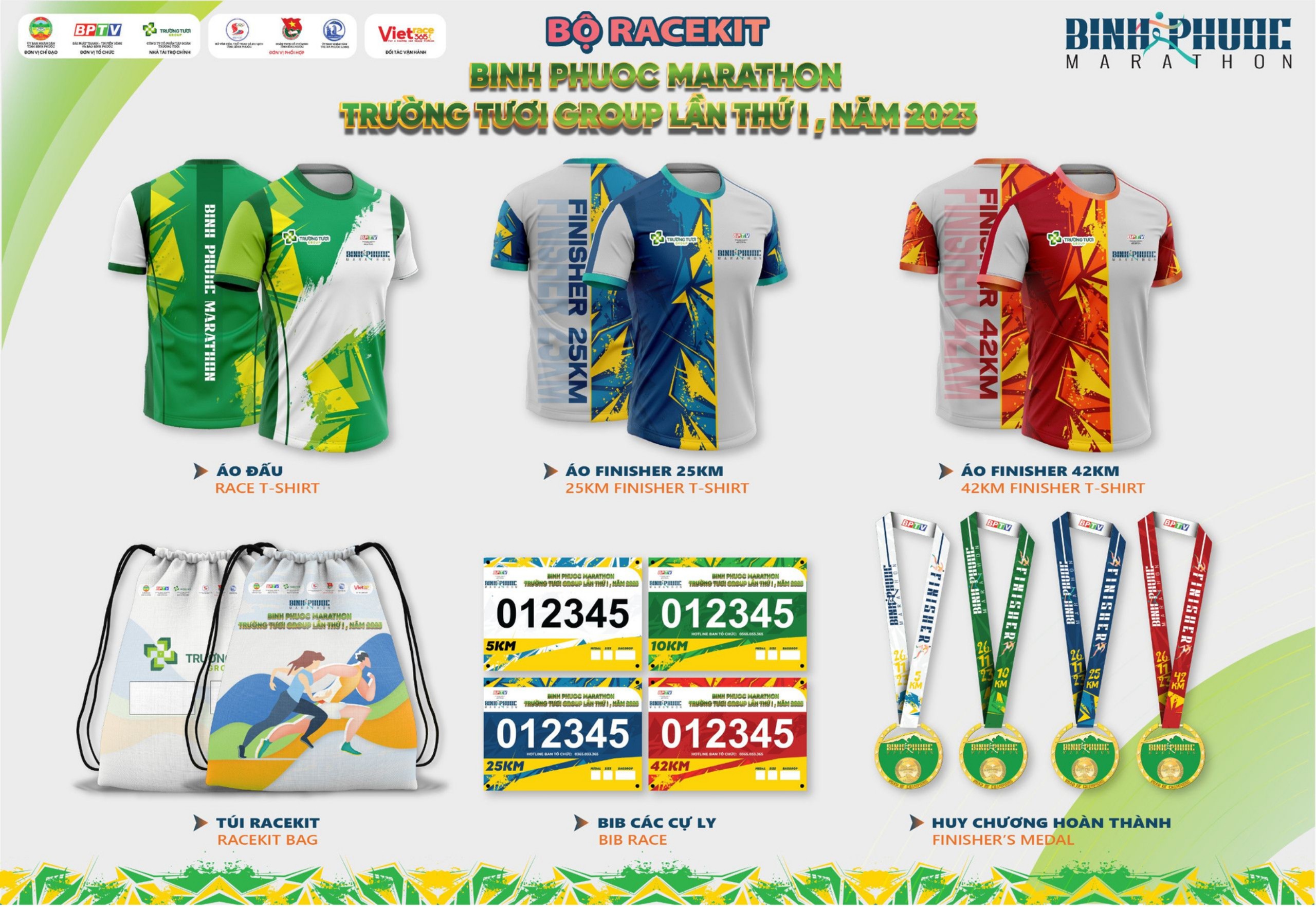 Bộ racekit được thiết kế khá ấn tượng gồm: Bib, áo đấu, áo finisher (hoàn thành cự ly), túi đồ cá nhân và huy chương hoàn thành cự ly… dành cho các runner mua vé tham gia Giải Bình Phước marathon - Trường Tươi Group lần thứ I, năm 2023