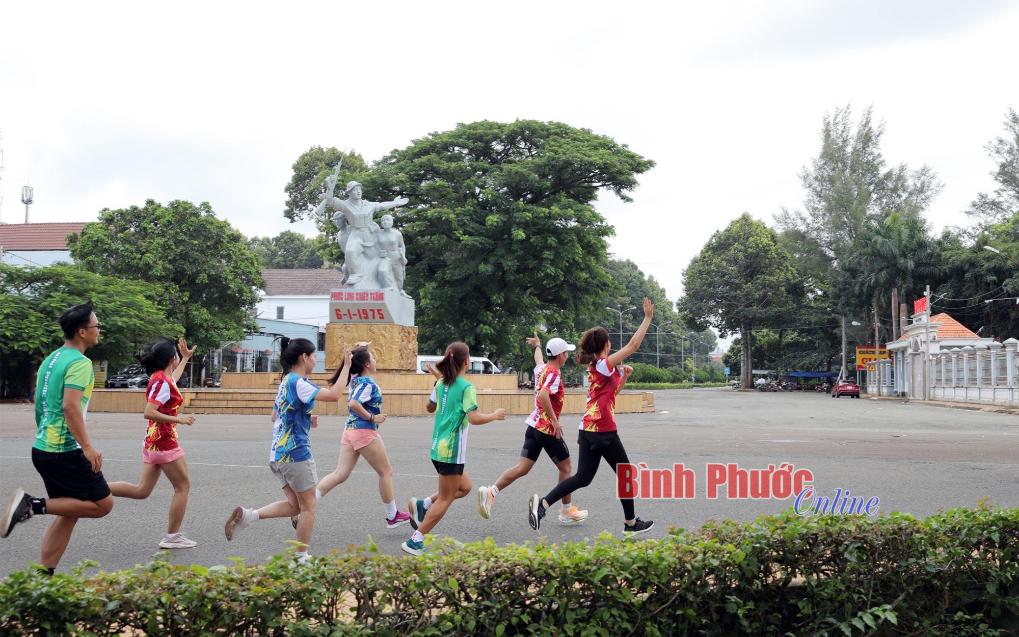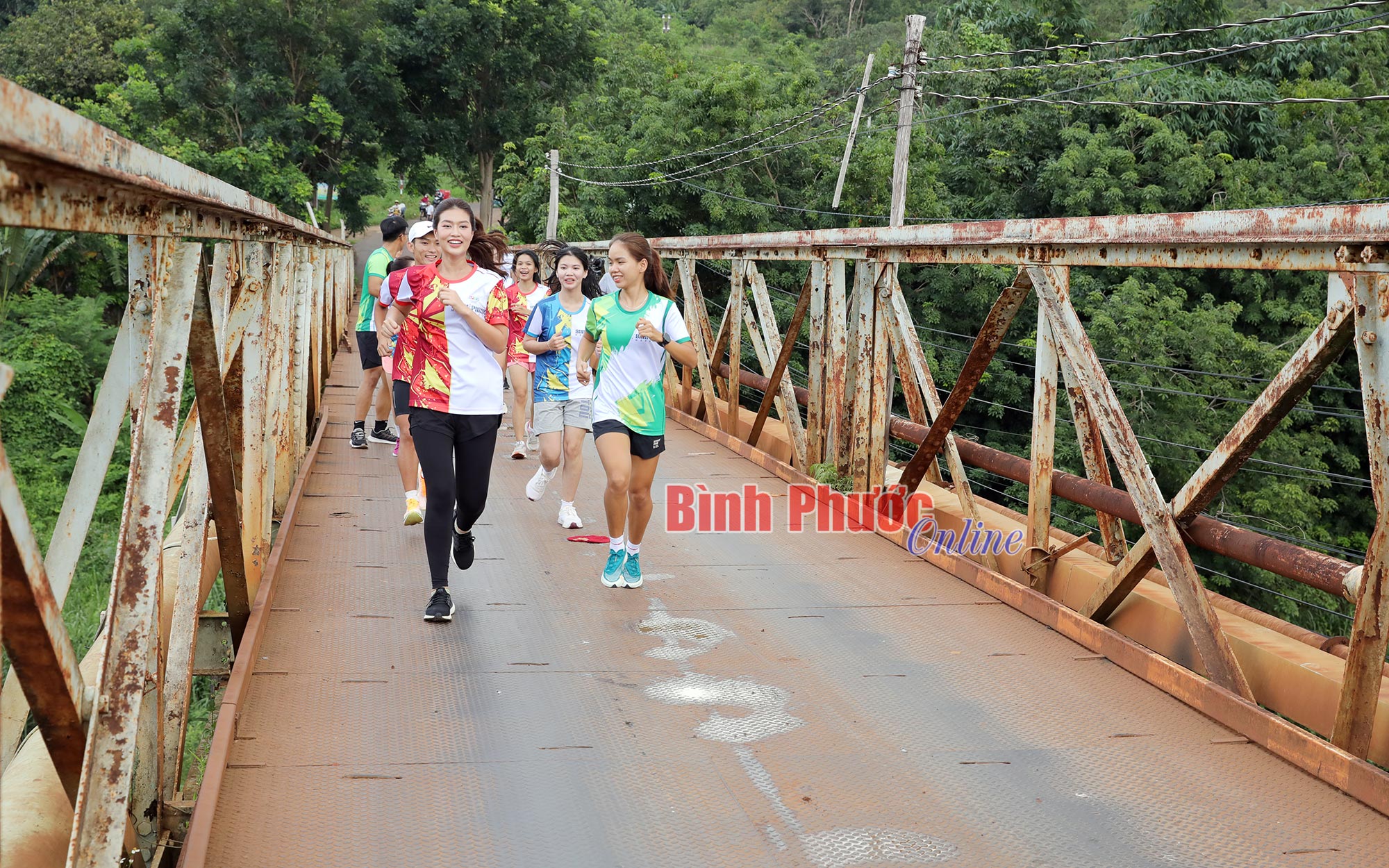 Các đại sứ giải và vận động viên tập luyện đường chạy đoạn qua cầu Đắk Lung, thị xã Phước Long
