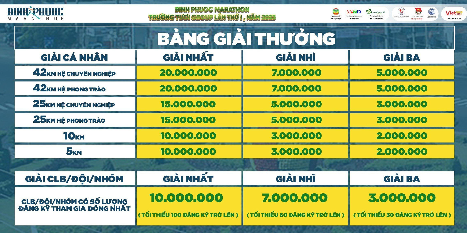 Dù chi phí đăng ký tham gia khá ưu đãi nhưng giải thưởng của Giải Bình Phước marathon - Trường Tươi Group lần thứ I, năm 2023 khá hấp dẫn