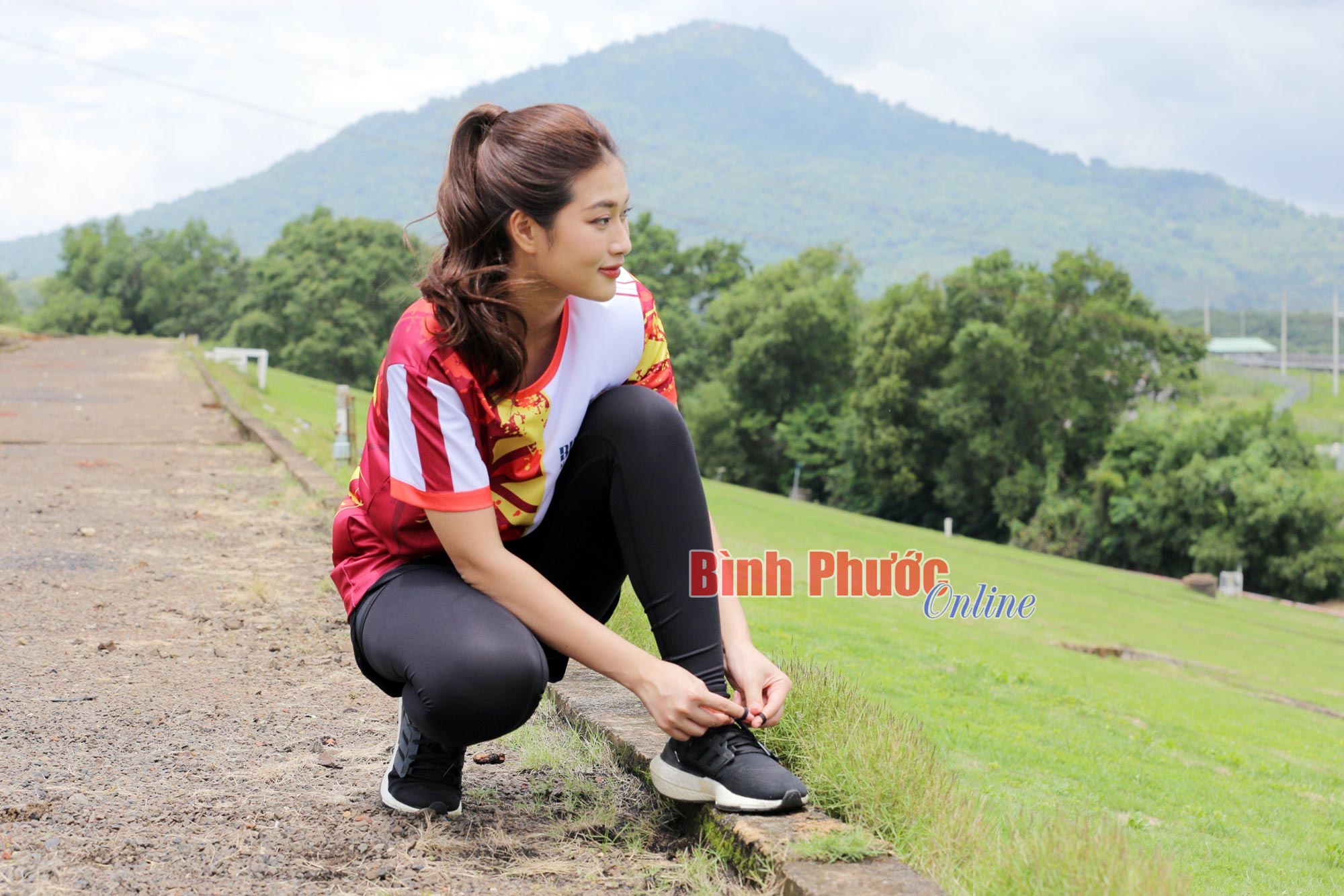 Hoa hậu Đoàn Thiên Ân với cung đường chạy đoạn đập tràn Thủy điện Thác Mơ, mờ xa ẩn hiện là ngọn núi Bà Rá uy nghi