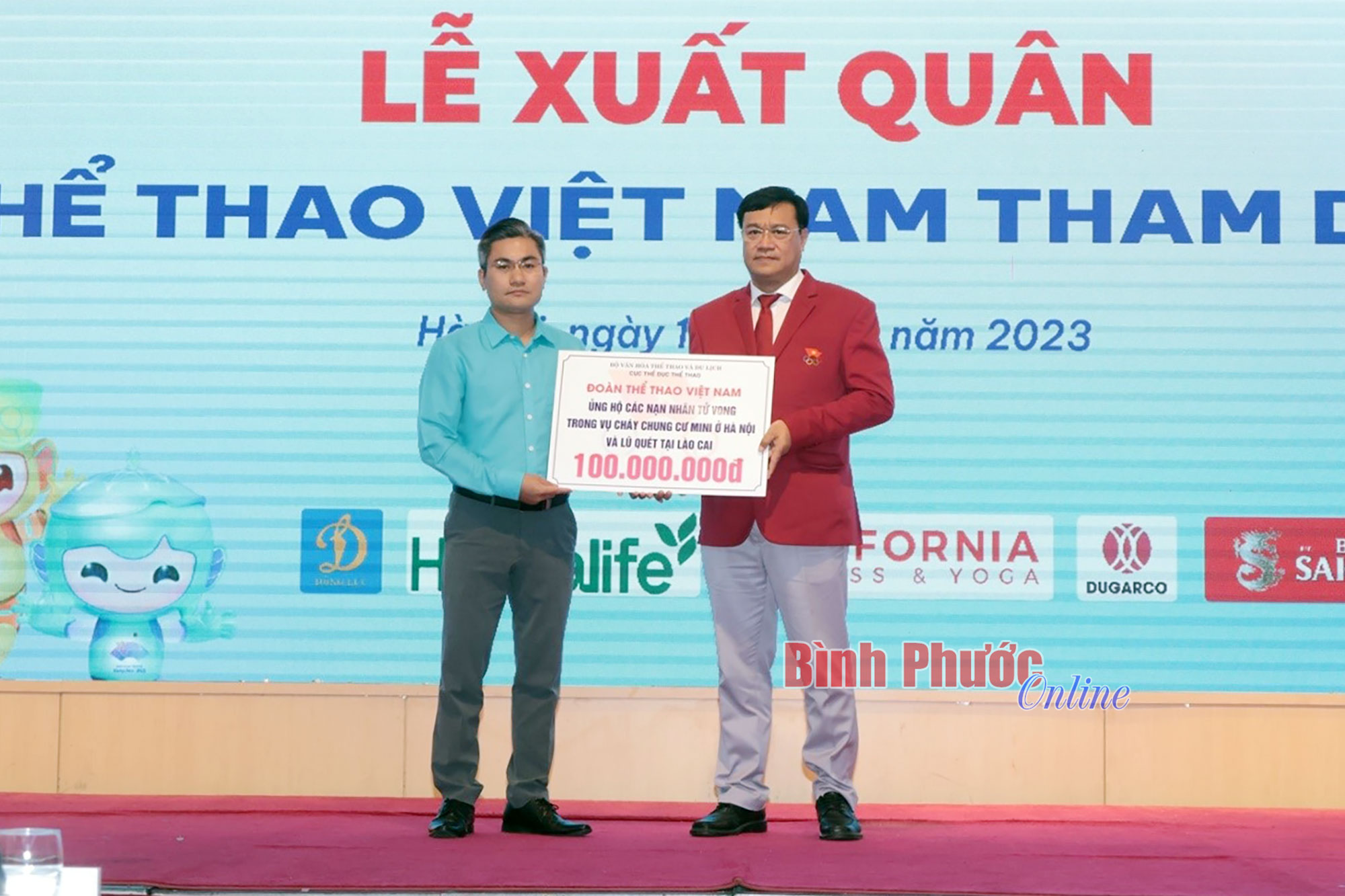 Ông Đặng Hà Việt, Trưởng đoàn thể thao Việt Nam tại Asian Games 19 trao kinh phí hỗ trợ các nạn nhân vụ hỏa hoạn chung cư mini tại Hà Nội và lũ quét ở Lào Cai
