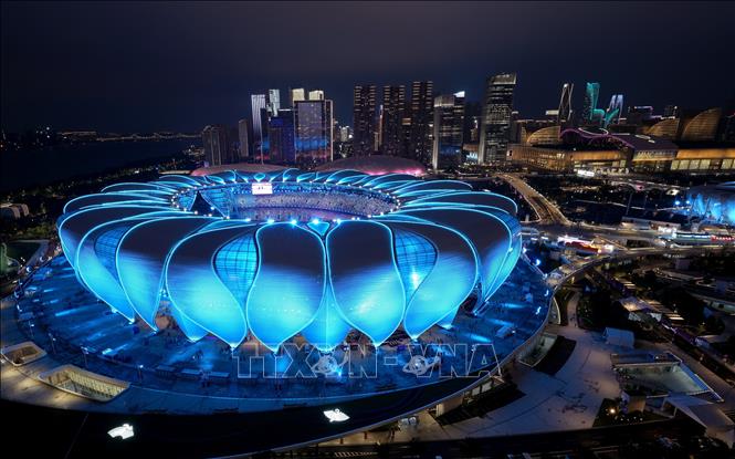 Sân vận động Olympic tại thành phố Hàng Châu, tỉnh Chiết Giang, Trung Quốc, được thắp sáng khi diễn ra lễ khai mạc ASIAD lần thứ 19 ngày 23-9-2023. Ảnh: THX/TTXVN