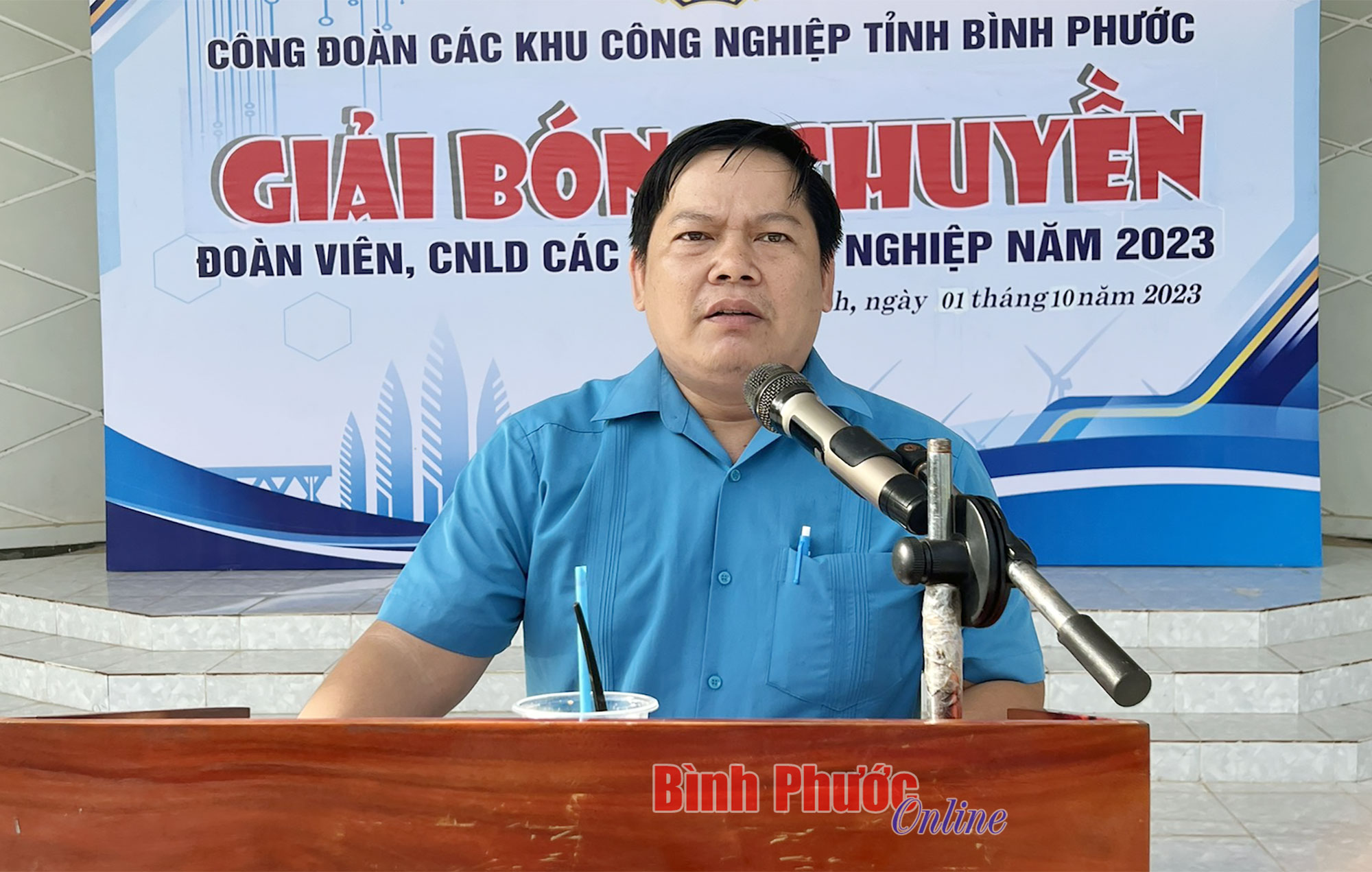 Ủy viên Ban Chấp hành Tổng Liên đoàn Lao động Việt Nam, Chủ tịch Công đoàn các KCN tỉnh Trần Bá Lợi phát biểu tại buổi khai mạc