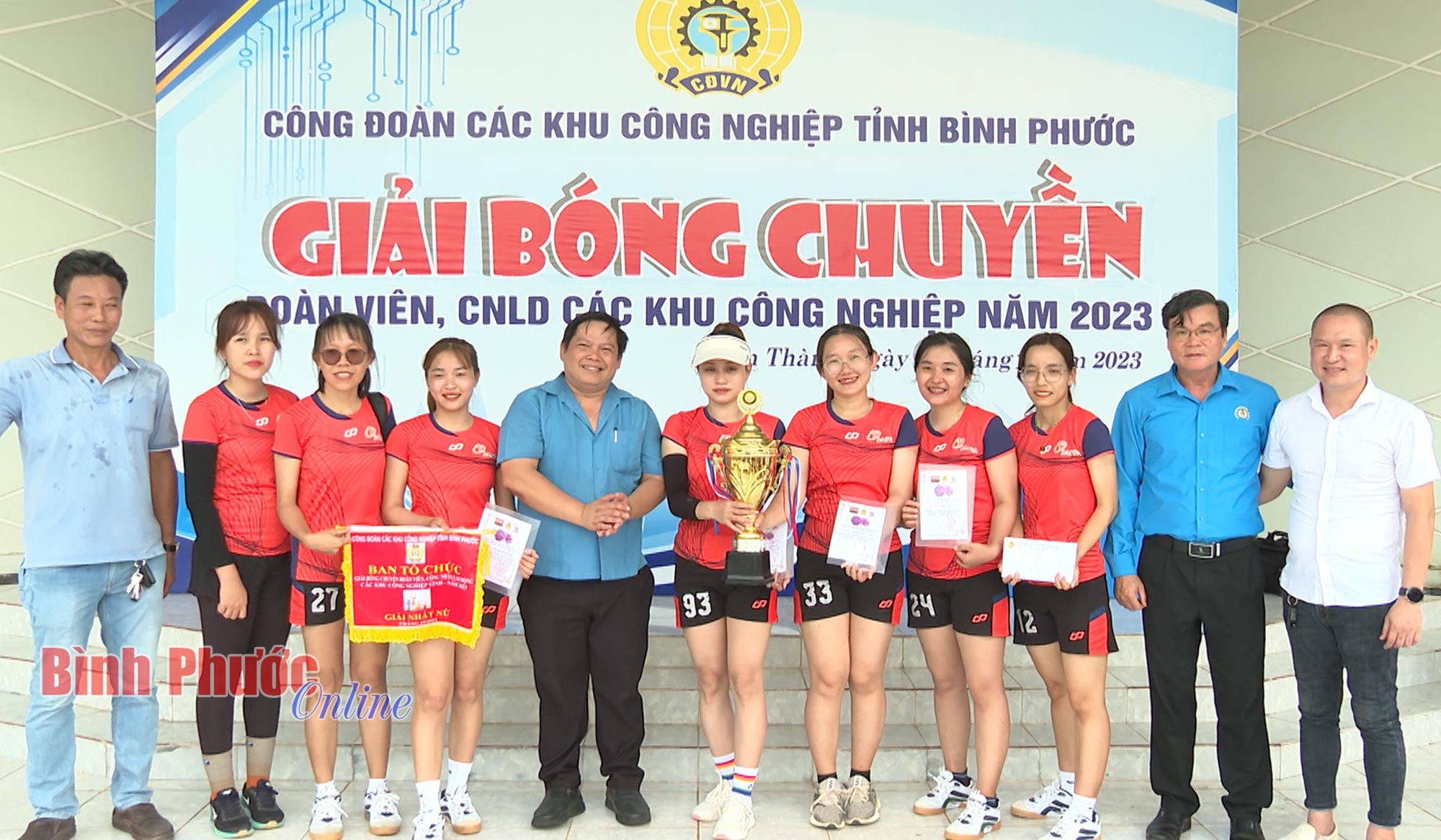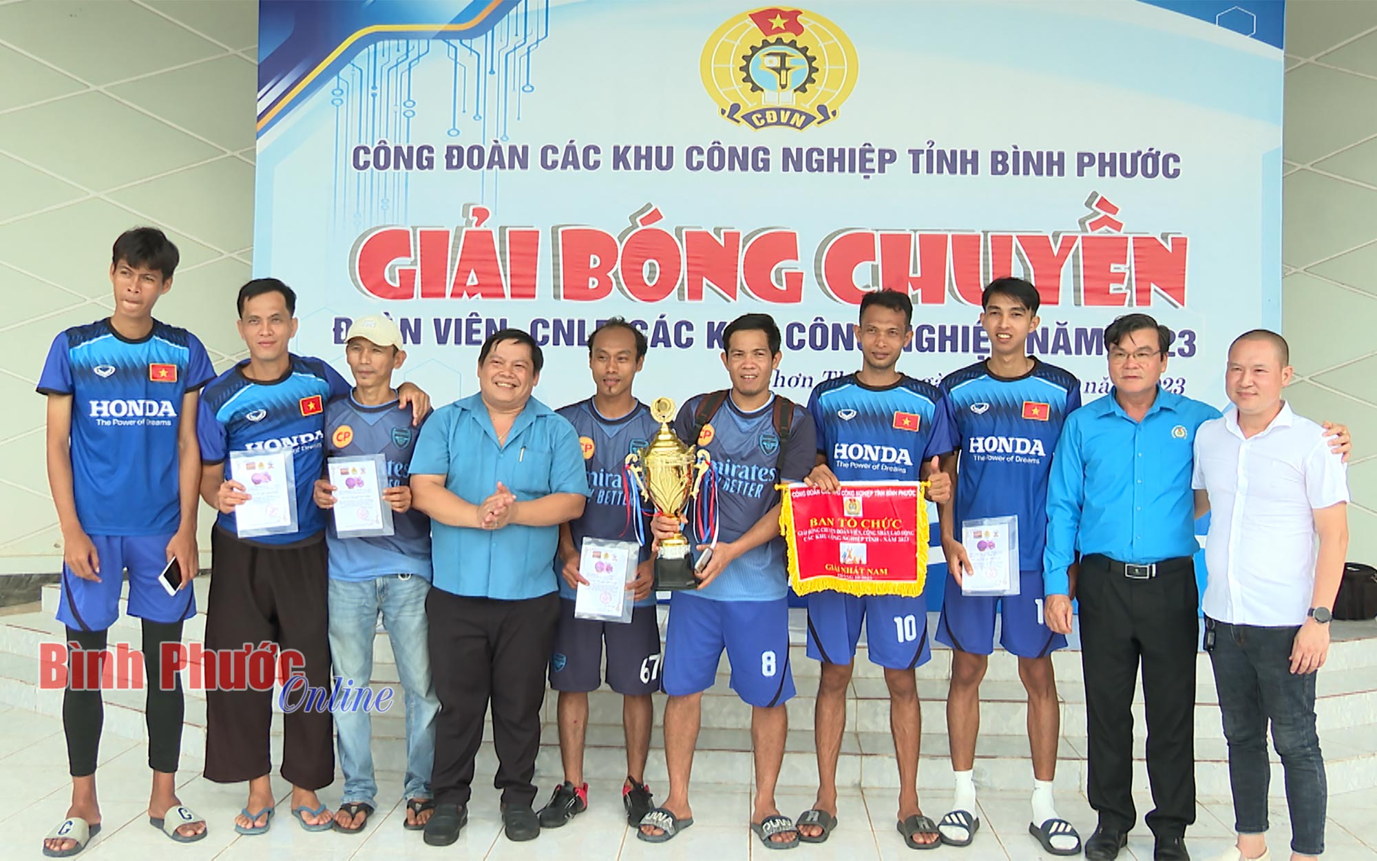 Lãnh đạo Liên đoàn Lao động tỉnh, Công đoàn các Khu công nghiệp tỉnh Bình Phước trao cúp vàng bóng chuyền nam cho đội số 2 Công ty TNHH CPV Food