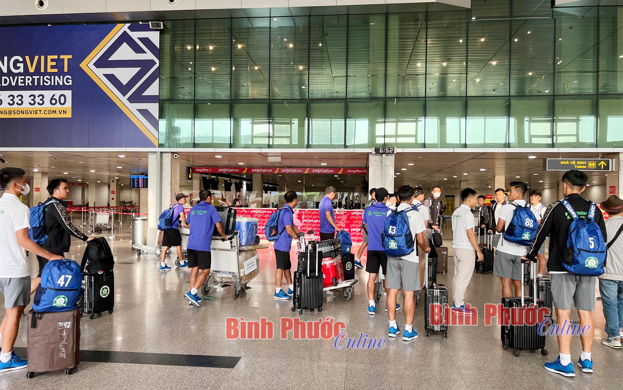 Các thành viên CLB Bóng đá Trường Tươi - Bình Phước có mặt tại Tân Sơn Nhất để di chuyển ra phía Bắc thi đấu với đội Hòa Bình ở vòng đấu thứ nhất
