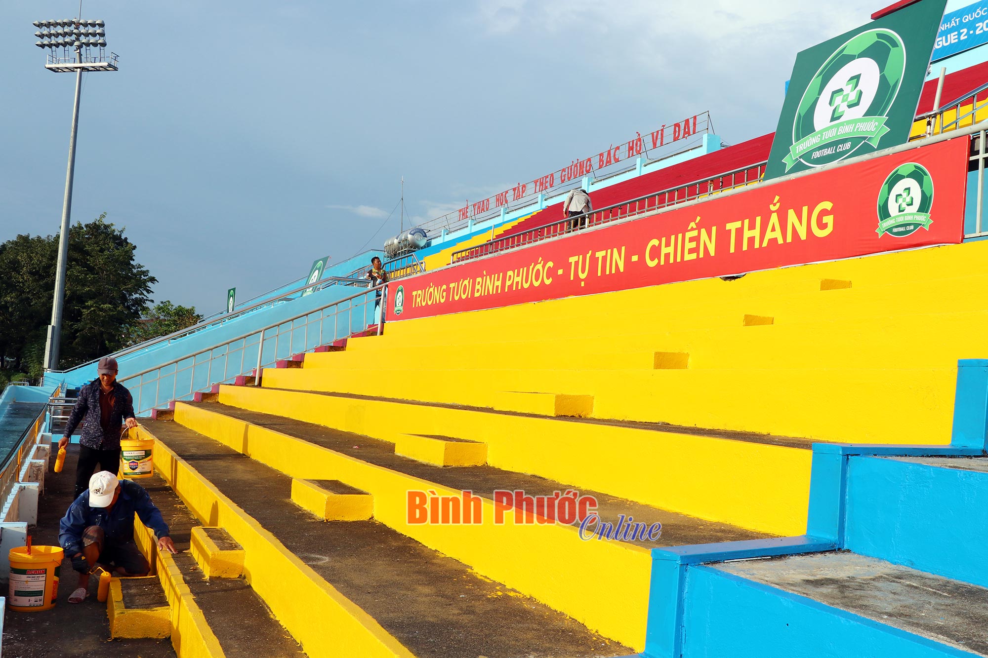 Công nhân đang sơn mới khán đài B sân vận động Bình Phước