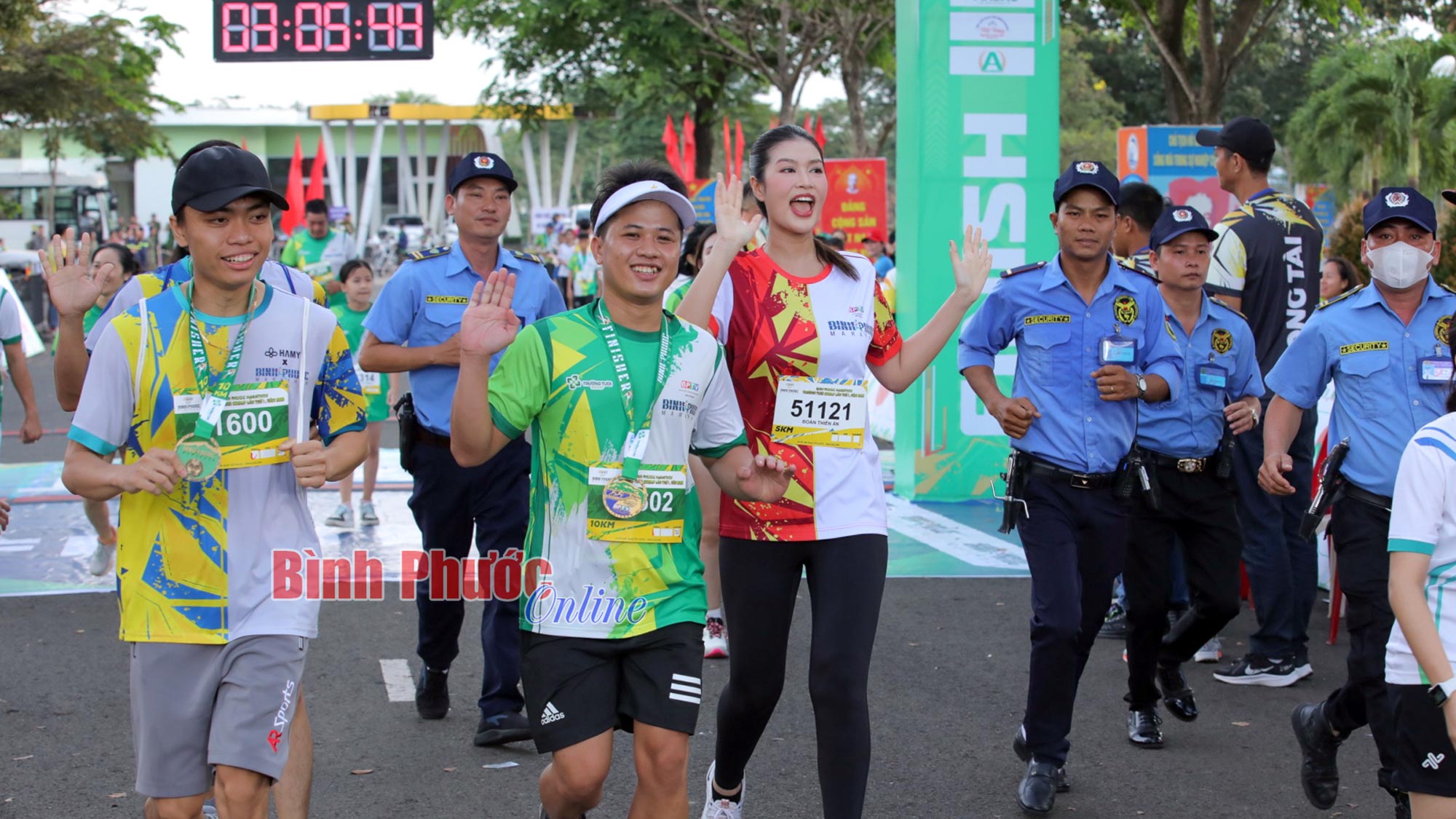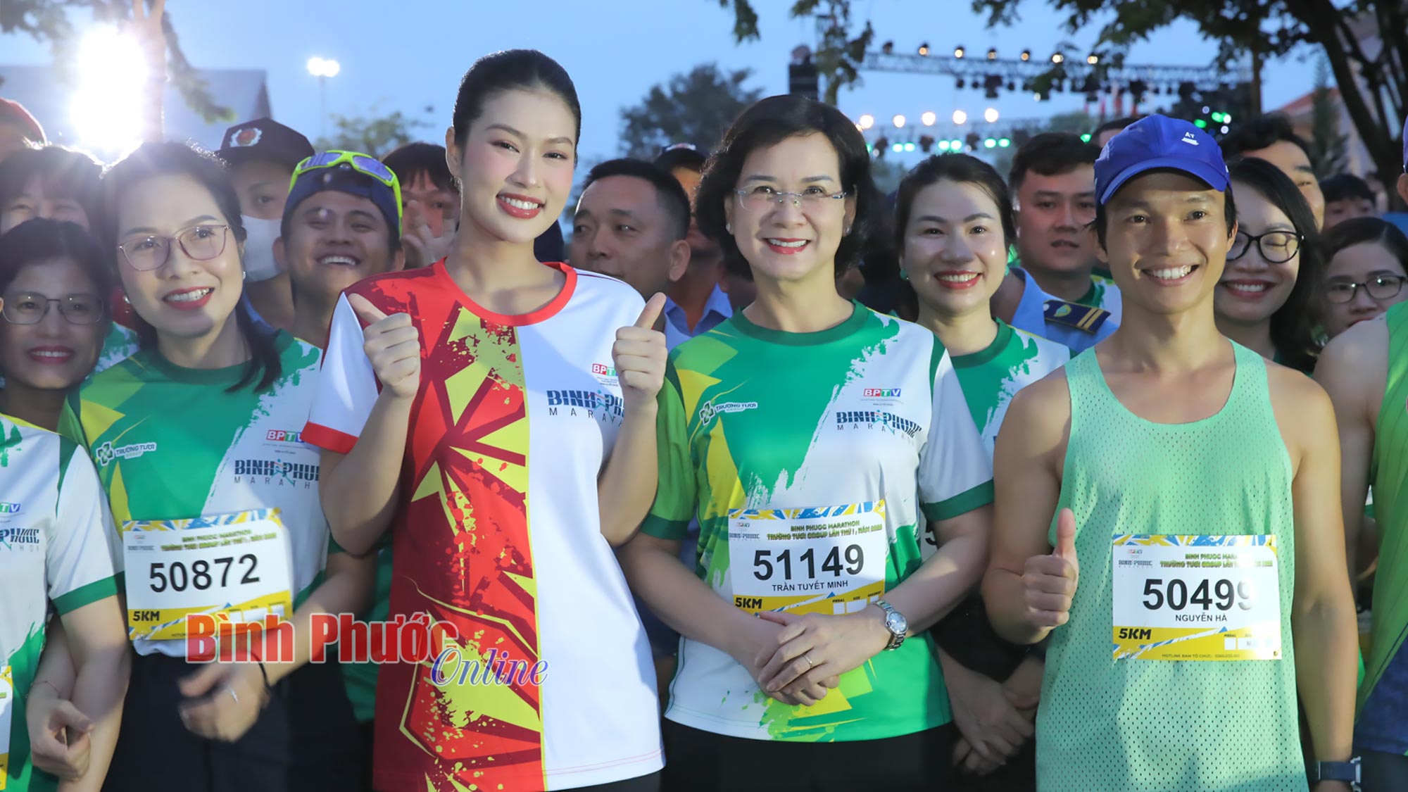 Hoa hậu Hoà Bình Việt Nam 2022 Đoàn Thiên Ân, đại sứ thương hiệu Giải Bình Phước marathon - Trường Tươi Group lần thứ I, năm 2023 cùng lãnh đạo tỉnh chuẩn bị xuất phát cự ly 5km